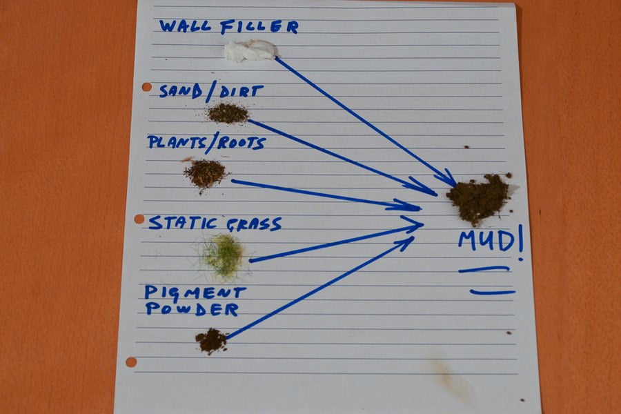 Пасты для имитации грязи выпускаются различными производителями в виде готовой продукции, они хороши в использовании, но мне захотелось попробовать создать собственную имитацию из подручных материалов. Так как в этом случае существует возможность игры цветов и некторой градации консистенции. А также это весело и не так бьет по бюджету.