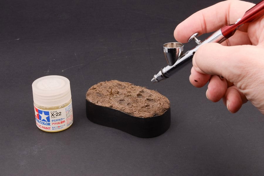 При полном высыхании мы получим матовую сухую поверхность земли, если необходим эффект влажной земли, то используем глянцевый лак, в нашем случае это Х-22 от Тамии, стоит учитывать что при распылении лака на грунт оттенок грунта становится более темным.